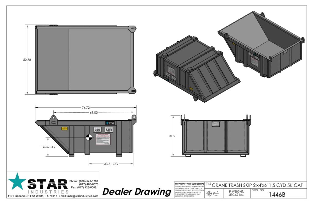 | 1446B | CRANE TRASH SKIP 2’D X 4’W X 6’L – with lifting eyes. Full fork pockets available | 1.5 cuyd. 5,000 lbs. | 925 lbs |