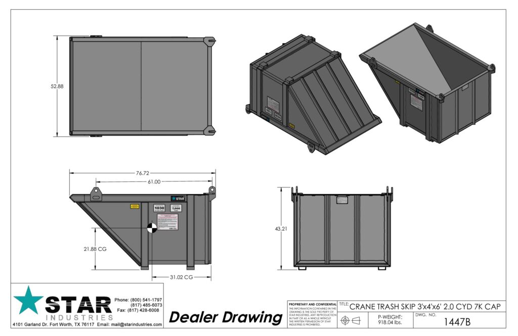 The Star Industries Crane Trash Skip has plenty of capacity to handle almost any kind of trash or bulk material. Designed to be hoisted with a set of 10ft or longer cable straps it’s a safe and easy way to remove ‘tear off’ and other construction refuse from roofs and decks.- Heavy 3/16" steel plate construction