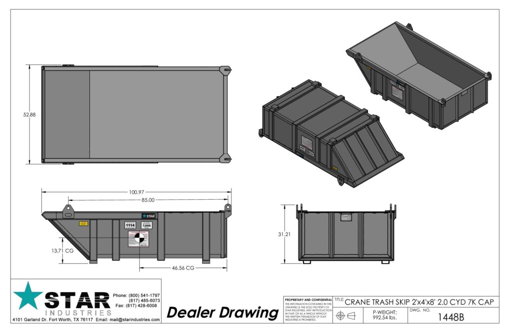| 1448B | CRANE TRASH SKIP 2’D X 4’W X 8’L – with lifting eyes | 2.0 cuyd. 7,000 lbs. | 1114 lbs. |
