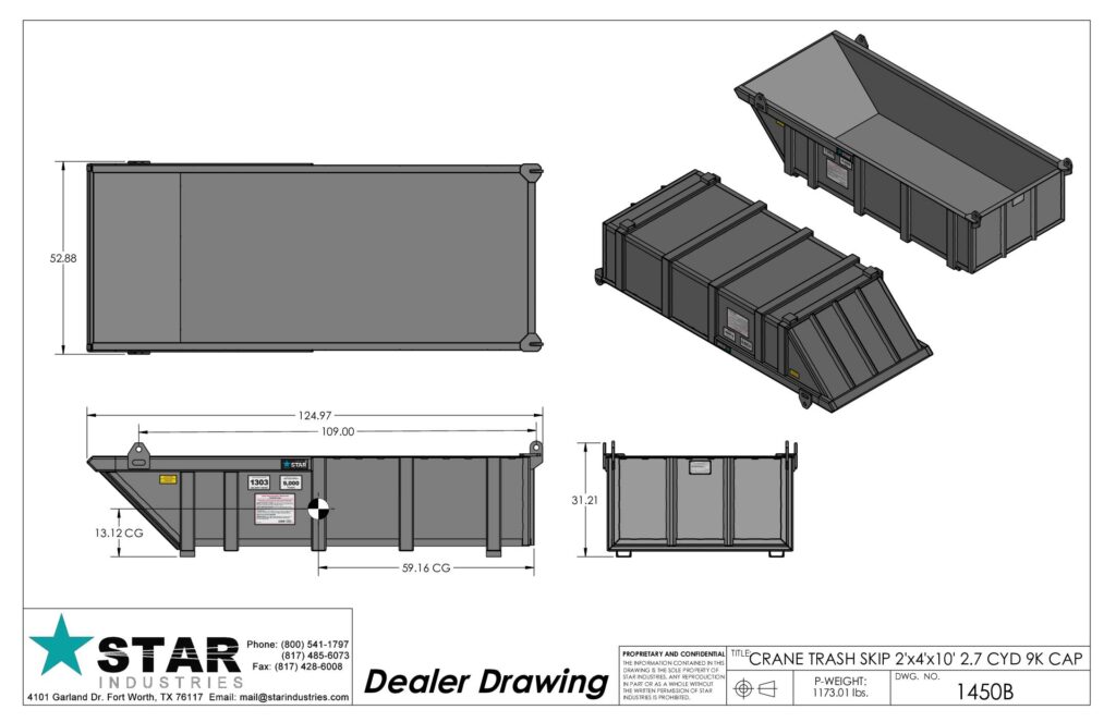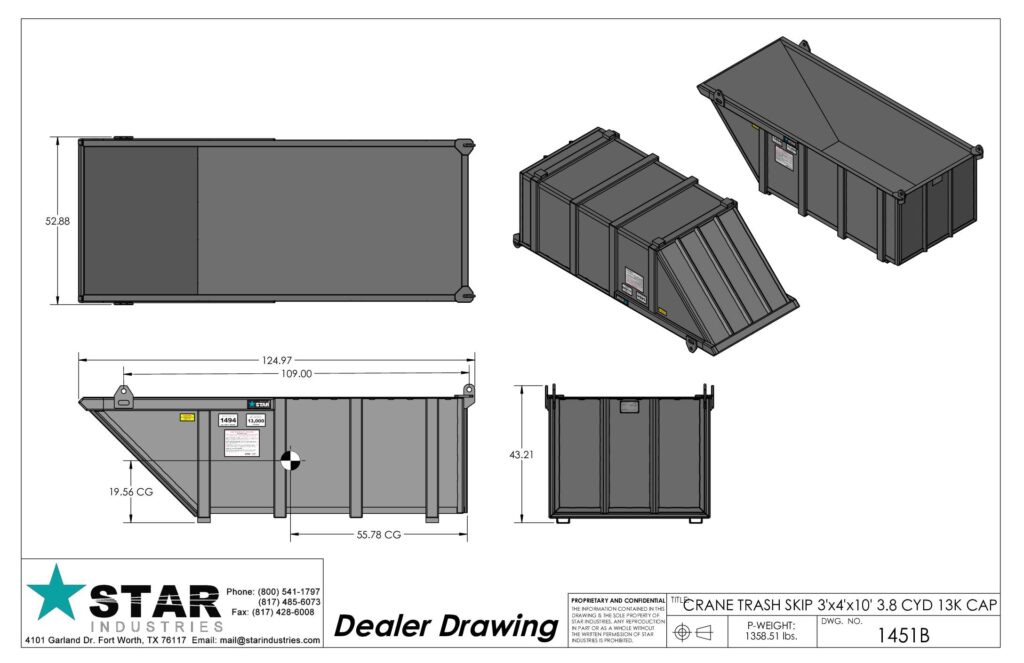 | 1451B | CRANE TRASH SKIP 3’D X 4’W X 10’L – with lifting eyes | 3.8 cuyd. 13,000 lbs. | 1494 lbs. |