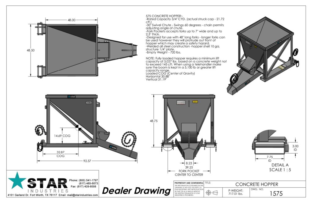 Save the extra cost of a concrete pump or crane and use your extendable forklift with a Star Industries concrete hopper. It’s the perfect solution to place concrete in hard to reach places and the ¾ cuyd capacity allows for plenty of concrete to be placed at once.- Universal fit (slip-on-forks) suitable for both straight mast and extendable reach forklifts