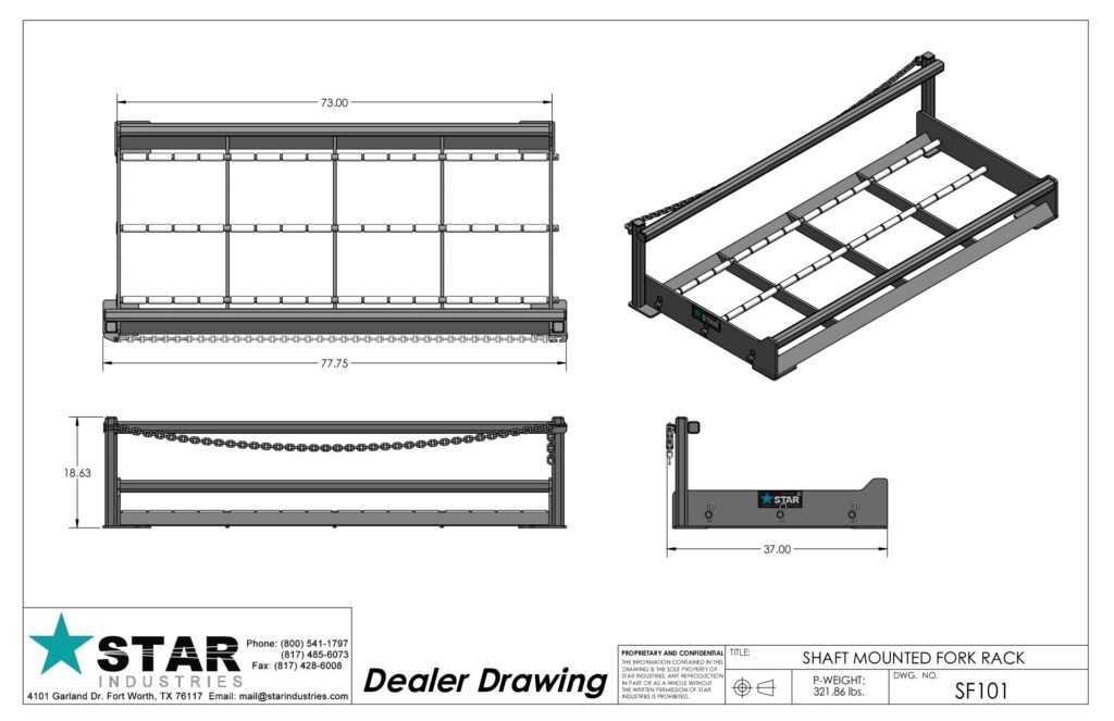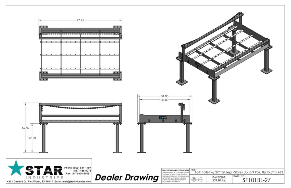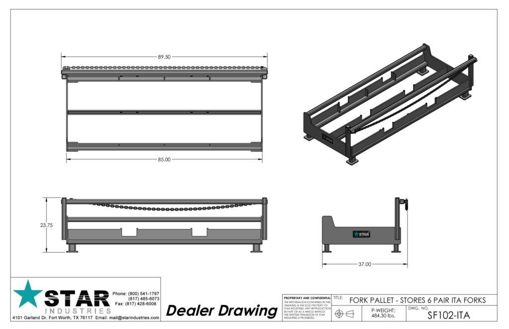 Keep forks organized, off the ground and safe from damage with a Star Industries Fork Storage Pallet. The innovative pallet design eliminates the heavy lifting of forks and makes it simple to remove, store and re-attach forks.- Accepts forks up to 3” thick and 96” long
