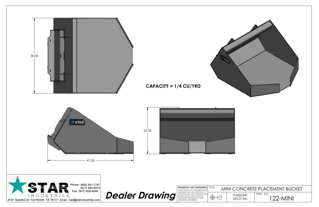 The Star Industries Mini Concrete Placement Bucket allows operators to use their Mini Skid Steer to move and pour concrete the easy way. It is the perfect replacement for the wheel barrow and has no moving parts or hydraulics to get contaminated with concrete mix, dust and dirt.